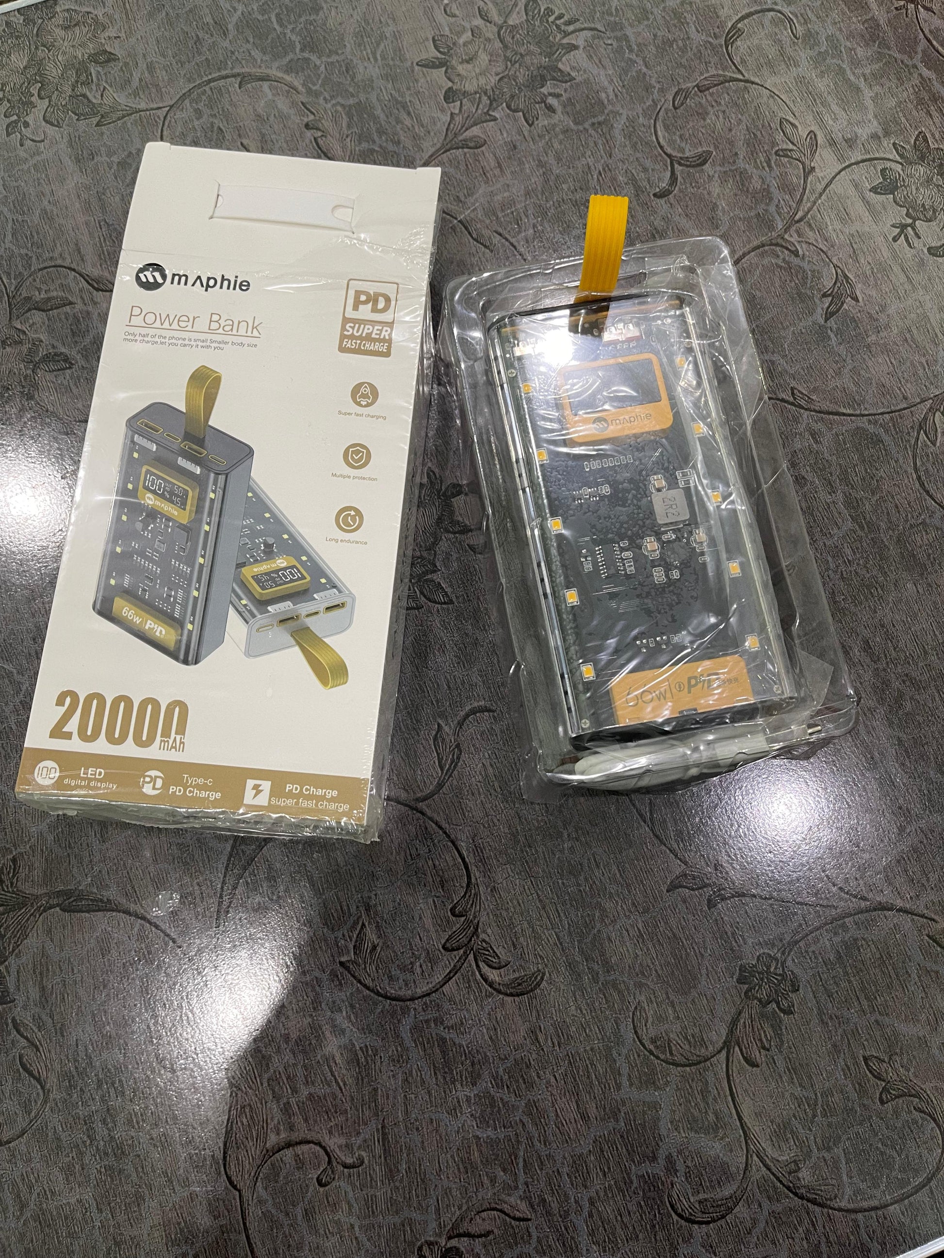 Stay powered up in style with the Maphie 20000mAh Transparent Power Bank, designed for those who want performance, style, and innovation in one device. Featuring a crystal-clear body, this power bank lets you see the high-tech components inside — paired with vibrant LED lights and a smart digital display showing real-time battery status.